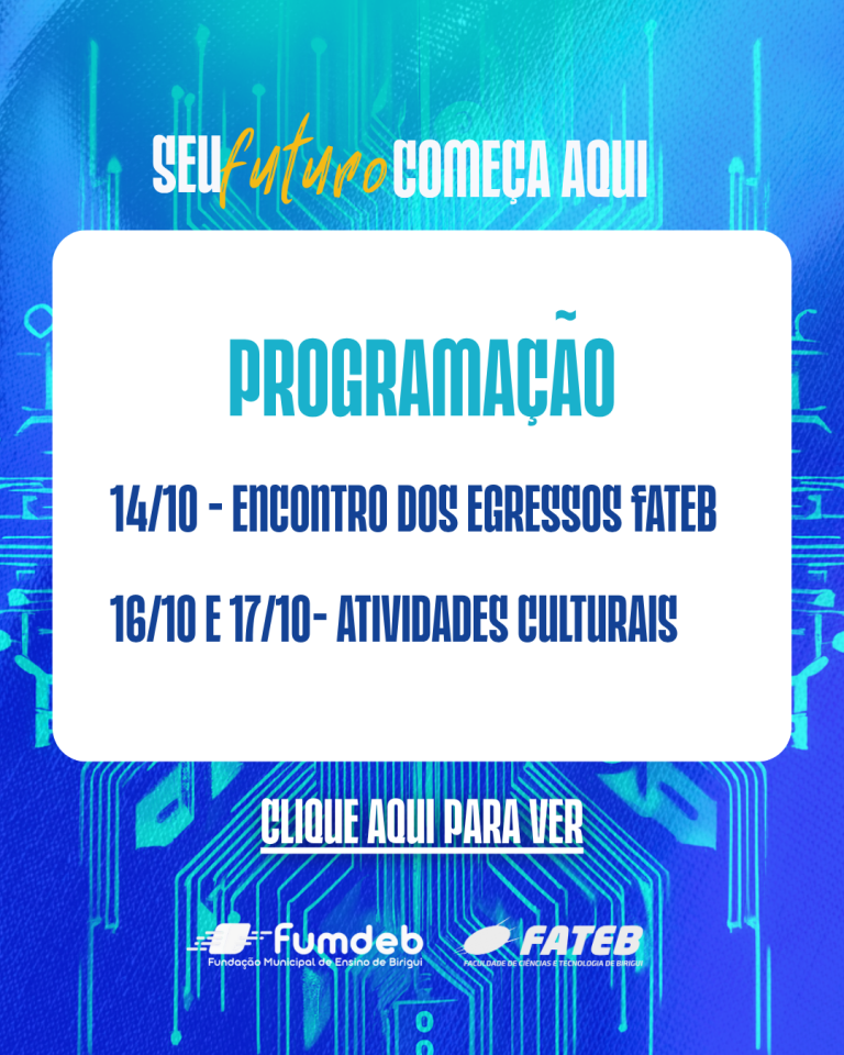 Já nos dias 16 e 17 de outubro, a FATEB se transforma em um grande palco de atividades culturais, oficinas, treinamentos, exposições, networking, júri simulado e maratona de programação, reunindo alunos, professores e a comunidade em torno da inovação, do conhecimento e da expressão artística.