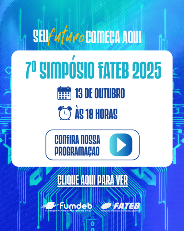 Já nos dias 16 e 17 de outubro, a FATEB se transforma em um grande palco de atividades culturais, oficinas, treinamentos, exposições, networking, júri simulado e maratona de programação, reunindo alunos, professores e a comunidade em torno da inovação, do conhecimento e da expressão artística.