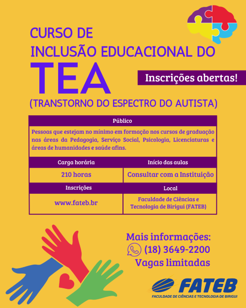 A FATEB (Faculdade de Ciências e Tecnologia de Birigui) está com matrículas abertas para o curso de aperfeiçoamento de Inclusão Educacional do TEA (Transtorno do Espectro do Autista) - O objetivo central é formar profissionais, professores e educadores dos diferentes seguimentos e modalidades de ensino, com o intuito de prepará-los para o exercício profissional. As aulas serão conduzidas por professores Mestres e Doutores.