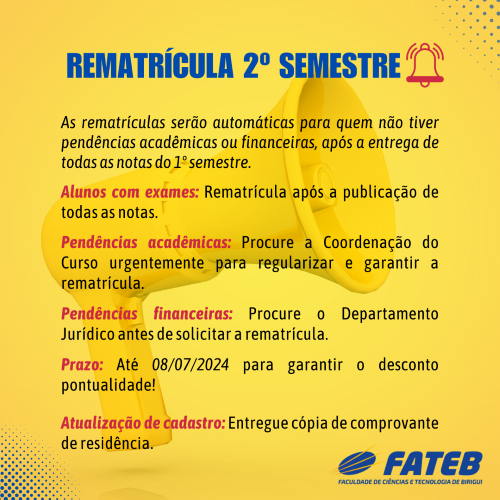 As rematrículas para o segundo semestre letivo de 2024 serão feitas automaticamente para todos os alunos que não tiverem pendências acadêmicas e/ou financeiras após a entrega de todas as notas correspondentes ao primeiro semestre.